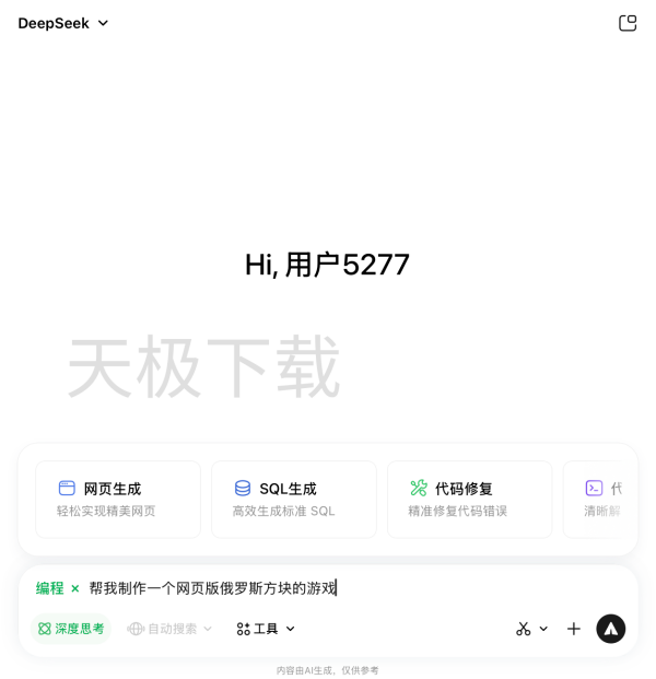 2.在对话框输入需求,例如:帮我制作一个网页版俄罗斯方块的游戏。