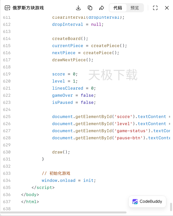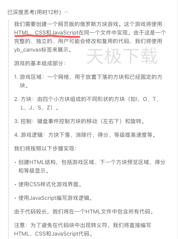 3.稍等片刻,腾讯元宝就会给出网页版俄罗斯方块游戏的代码。