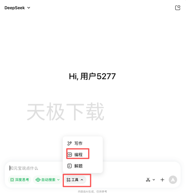 1.打开腾讯元宝,点击【工具】-【编程】。
