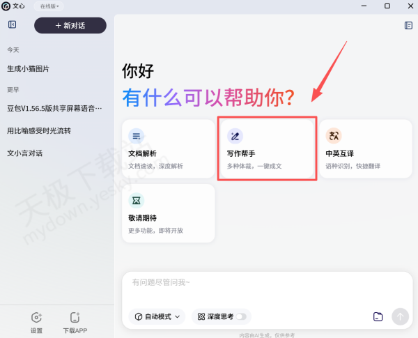 1.下载并打开文小言最新版本,在首页点击上方【写作帮手】。