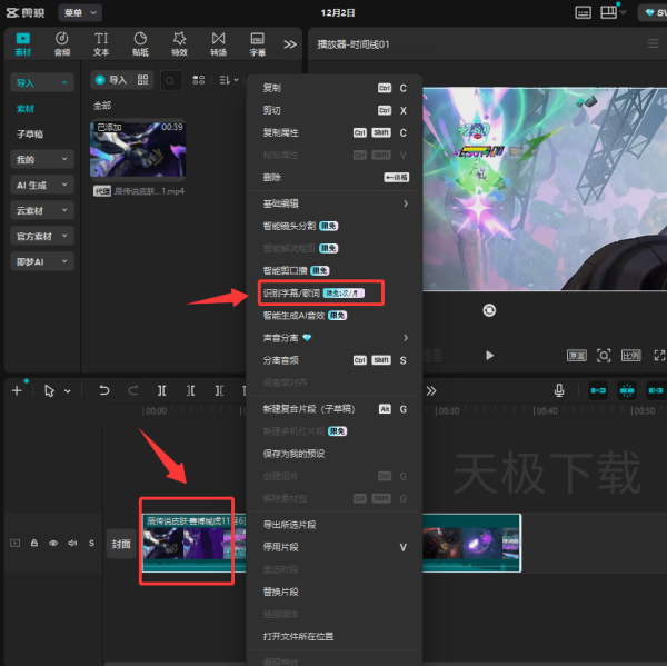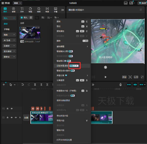2.右键时间轴上的素材,选择【识别字幕/歌词】。