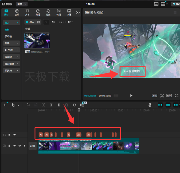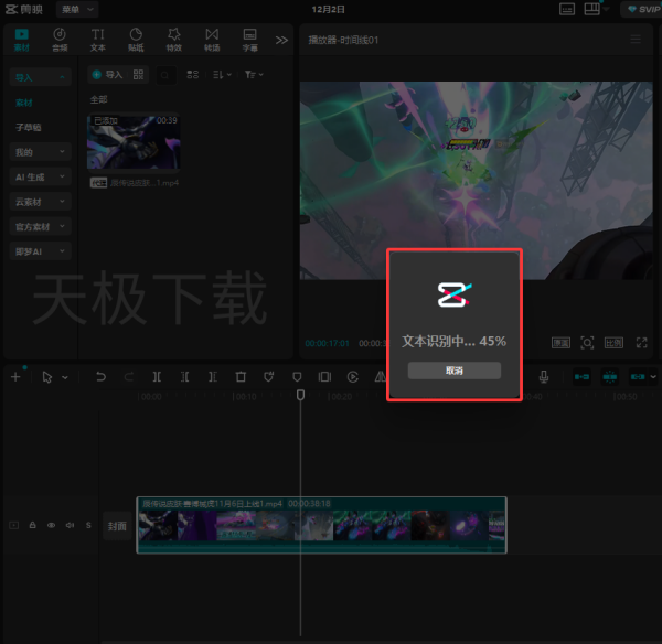 4.识别完成后,时间轴上方会出现字幕素材,同时预览框内也会出现字幕。