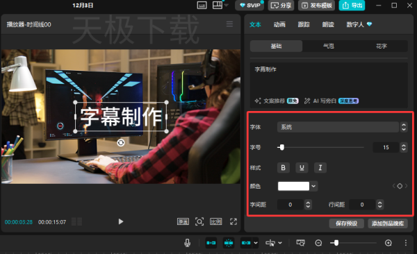 4.右上角可以调整字幕的字体、字号、样式、颜色、间距等参数,调整完毕即可添加字幕到视频中。