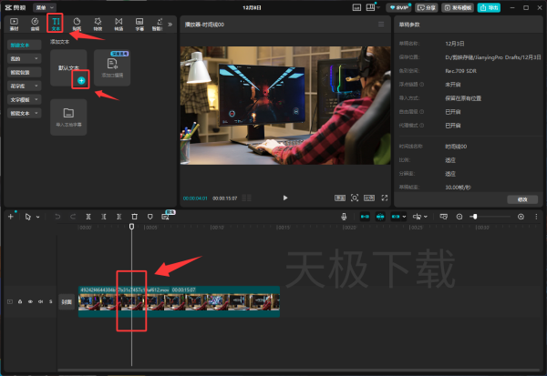 2.将指针定位到需要制作字幕的时间轴,点击上方的【文本】,点击【默认文本】右下角的【+】键。