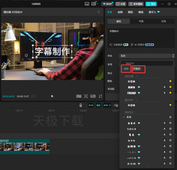剪映自带的字幕字体分为【全部】和【可商用】,用户需要区分是商业版权还是个人版权,如果需要用于商业用途,请使用【可商用】标签内的字体。
