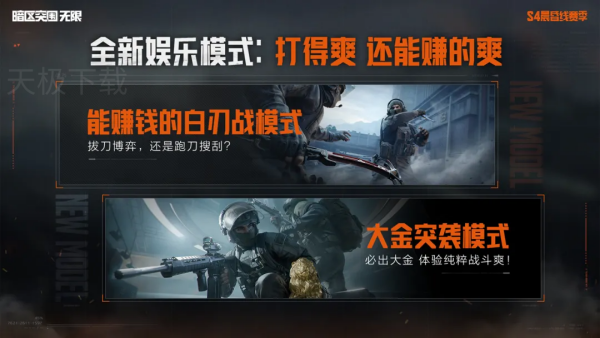 ●全新模式来袭:S4赛季将推出两个特色迥异的新模式,大金突袭模式会强化资源争夺的激烈程度,而白刃战模式则更侧重轻装突袭的战斗快感,极大程度满足不同先锋的极限追求。