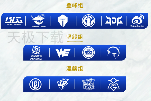 1.参赛队伍:共14支队伍,分为登峰组(BLG、AL、TES、IG、JDG、WBG)、坚毅组(NIP、WE、EDG、TT)、涅槃组(LGD、UP、LNG、OMG)