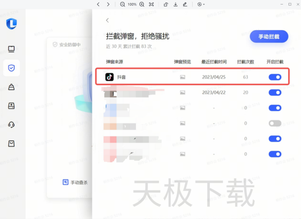 2.腾讯电脑管家:【权限管理】-【软件弹窗拦截】,找到抖音后,关闭拦截。
