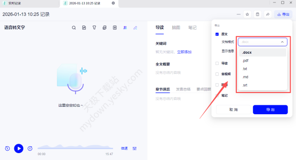 千问语音转文字导出都支持哪些格式答:.docx(Word文档)、.pdf(便携式文档格式)、.txt(纯文本)、.md(Markdown 文档)、.srt(字幕文件)。