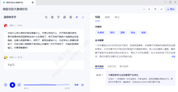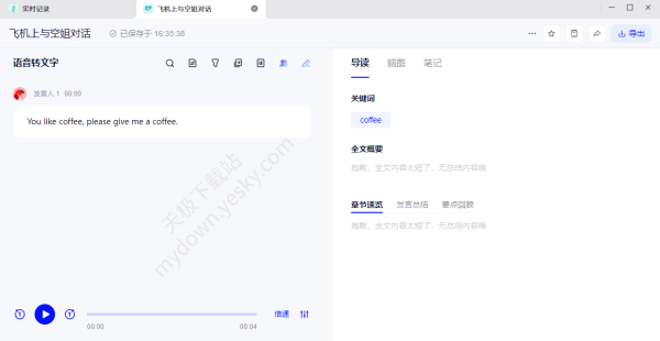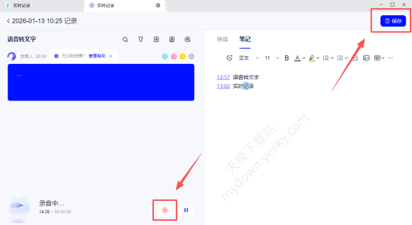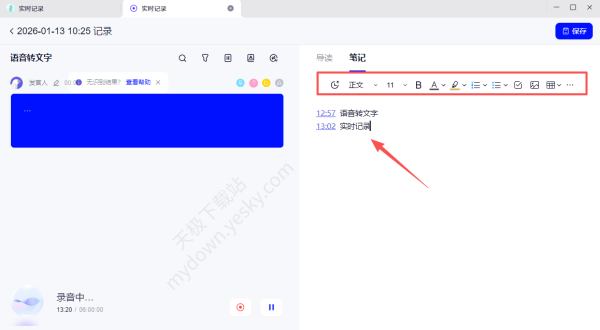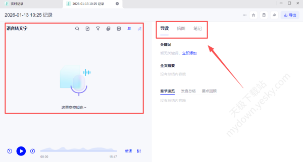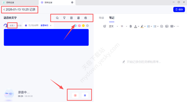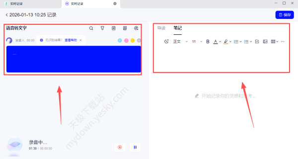 4、点击开始录音后进入记录页面,左侧是语音转文字区域,右侧是导读和笔记区域。