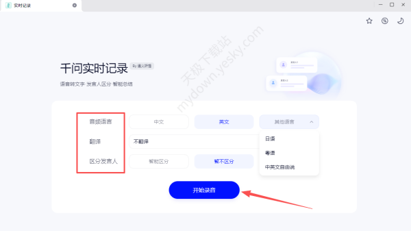 2、进入千问实时记录页面,选择【音频语言】,可以选择中文、英文、粤语、日语、中英文混合说。选择【是否翻译】,不翻译或者翻译为中文。选择【是否区分发言人】,智能区分或者暂不区分。选择完毕后点击【开始录音】。