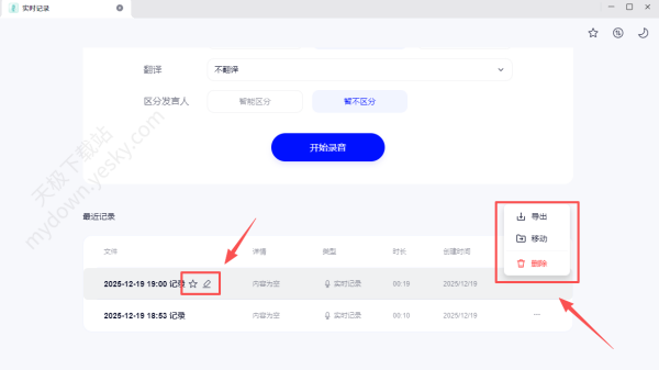 3、在下方还可以查询到最近记录,可以对历史记录进行收藏、重命名、导出、移动或者删除。