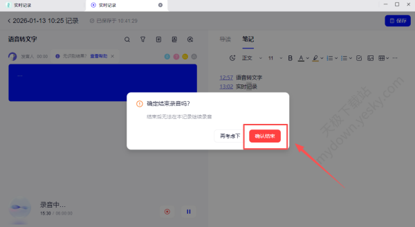 7、记录完毕后,点击右上角【保存】,接着点击【结束录音】,会跳出弹窗,点击【确认结束】即可。