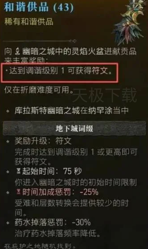 贡品加成:使用和谐贡品(Tribute of Harmony) 可确保最终BOSS掉落大量符文,推荐组队挑战提升效率