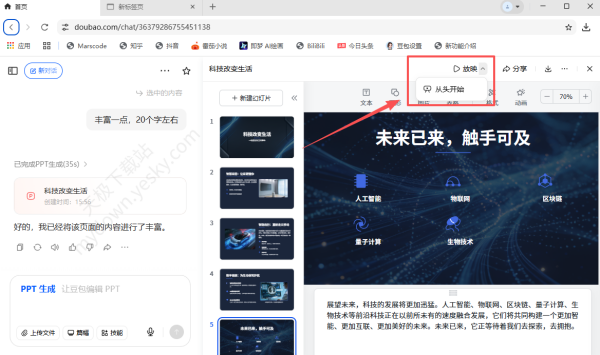 ●在豆包内可以直接放映PPT,展示效果。点击【放映】是从当前页面开始放映,点击放映右侧箭头也可以选择【从头开始】。