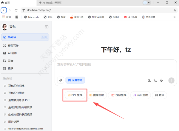 1、下载并打开豆包电脑版客户端,在对话框下方即可找到【PPT生成】,如果没有在对话框下方找到可以点击右下角【更多】,选择【PPT生成】。