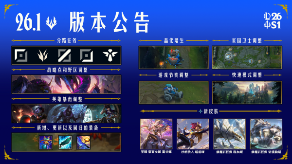 英雄联盟2026赛季新版本机制和调整变化汇总从英雄联盟26.1版本开始,新赛季迎来了全新的状态:涉及到的改变有分路任务、战略点、野区、全新装备、全新晶化增生、加入精灵视界,全新视野机制等,这些变化你都得知晓,我们等你来学习与掌握,欢迎您来到新赛季!