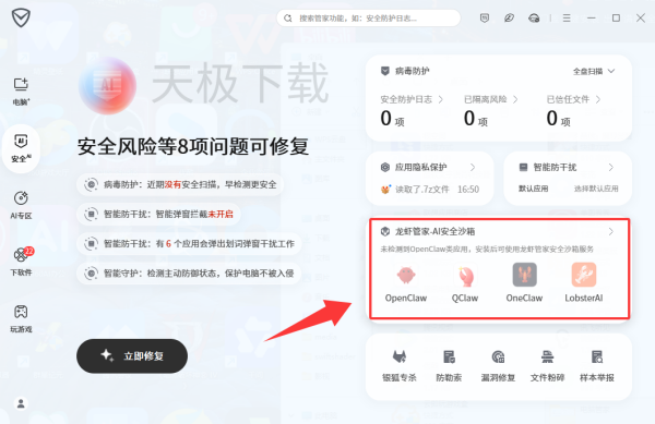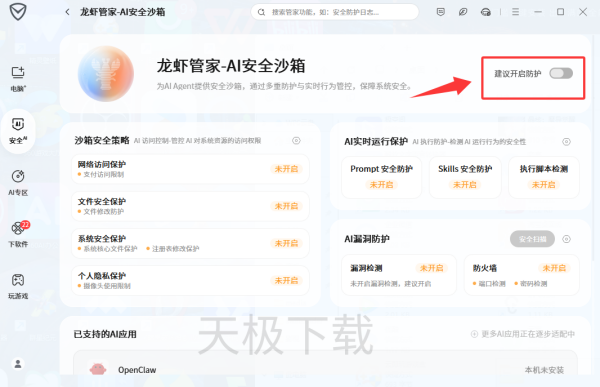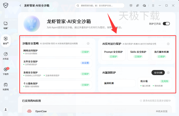 腾讯电脑管家AI安全沙箱(别称龙虾管家),是其18.0版本推出的面向本地AI智能体的专属安全防护功能。它通过构建独立虚拟运行环境,管控AI对系统底层资源的访问权限,一键开启系统、文件、Skills、Prompt等多重防护,可实时监测并拦截注入式攻击、越权访问、高危指令执行等风险,同时能发现修复AI应用漏洞、实现全链路操作留痕,全方位防范AI应用带来的系统篡改、隐私泄露等安全隐患。