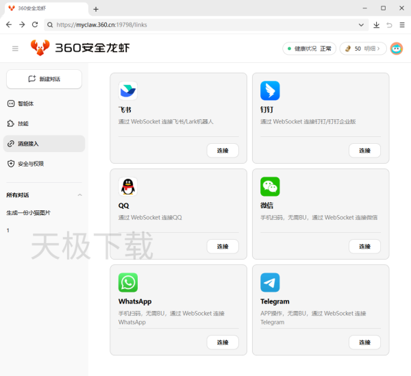 360安全龙虾可以接入社交软件,它原生支持一键接入微信、QQ等主流国内社交软件,同时兼容WhatsApp、Telegram等海外社交通讯工具,还可适配飞书、钉钉等办公IM平台,用户在产品的“消息接入”板块即可完成对应渠道的扫码绑定与配置,无需复杂的技术操作,就能直接在社交软件的聊天窗口内调用其AI智能体的各项能力,同时产品内置的龙虾卫士安全体系也会为接入后的全链路交互操作提供安全防护。