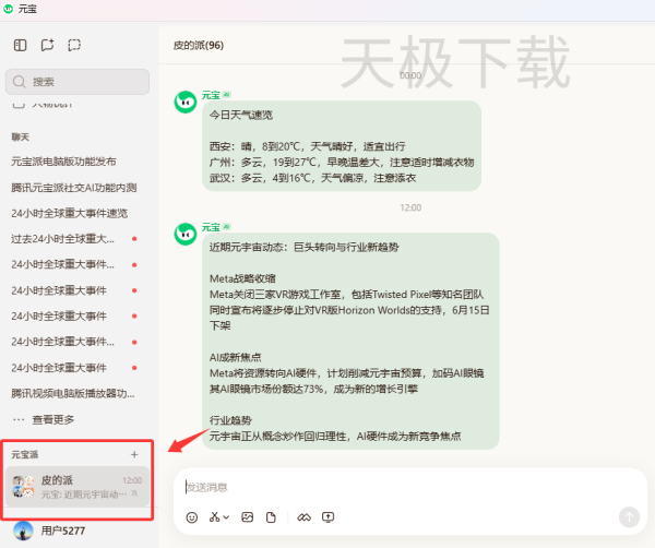 腾讯元宝电脑版的元宝派,是内嵌于元宝客户端的AI原生多人社交与协作空间,用户将元宝电脑版升级至最新版本后,即可在侧边栏一键唤起使用,它实现了手机与电脑端的消息、任务进度实时同步,能无缝衔接多端使用体验。