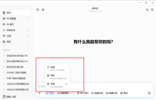 ➋. 进入对话页面,顶部会显示“快速、思考、专家”三个模式选项;