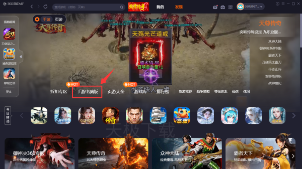 1.打开360游戏大厅主页,点击【手游电脑版】。