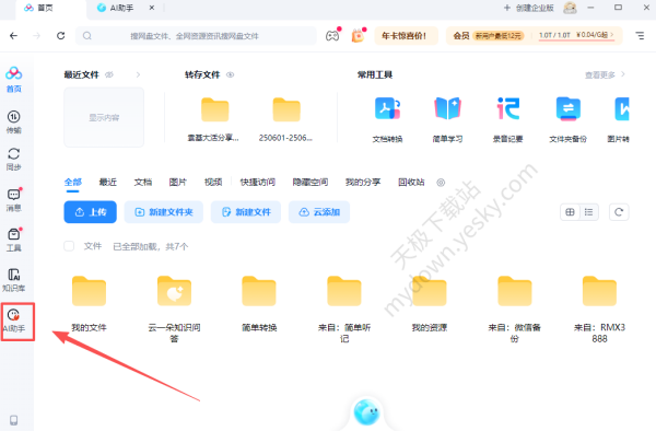 1、打开百度网盘电脑版,在左下角找到【AI助手】。