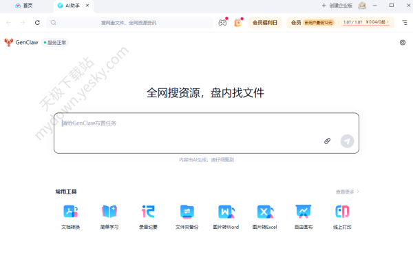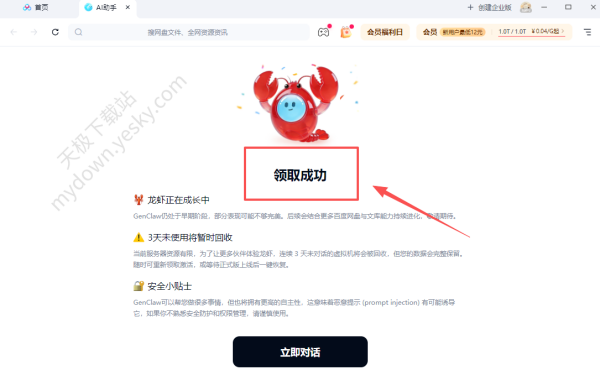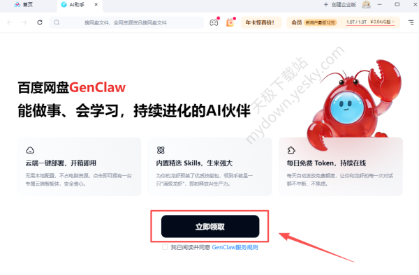 2、点击进来即可查看到【百度网盘GenClaw】,勾选下方【我已阅读并同意GenClaw服务规则】后点击【立即领取】即可。
